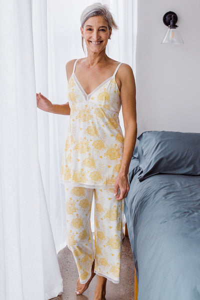 The Iris Lace Pajama Set is as soft and elevated as the iris flower, with delicate lace trim. The Chemise top features adjustable straps and is gathered under the bust for a relaxed babydoll silhouette. Cropped bottoms feature a soft elastic waistband and drawstring. 22" inseam. Pair with a matching Iris Lace Robe, Serenity Robe or Nina Robe for the ultimate in luxury sleepwear.