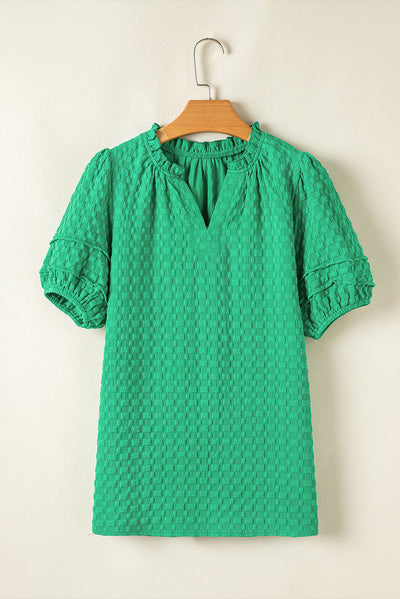 Elevate your fashion game with this textured top for ladies! Made from unique fabric, it boasts a frilled collar and puff short sleeve for a touch of playfulness. The notched v neck adds a feminine and elegant touch, making it the perfect match for any bottoms. Get ready to turn heads in this solid top!
