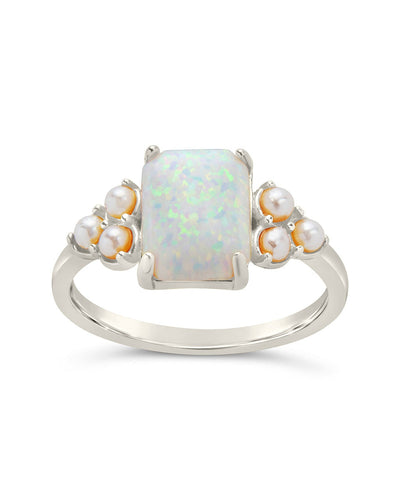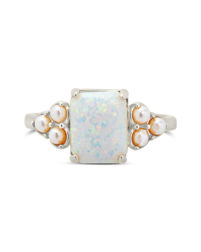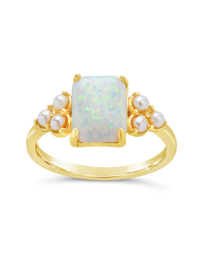 Love bold and feminine looks? You'll want to wear this striking opal and pearl ring everywhere you go! It features a bold opal center stone with pearl clusters. Available in gold and silver tones.