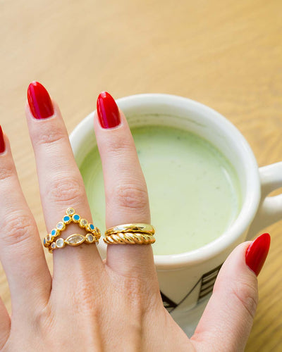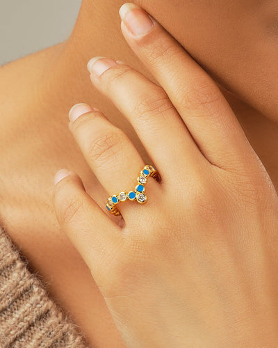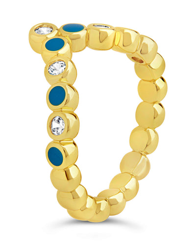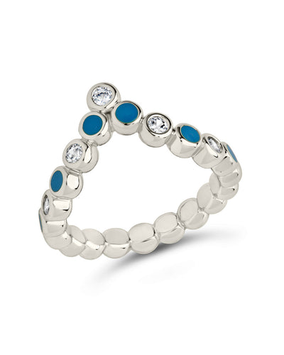 Add metallic shine and pops of color to your look with this pointed ring! It features a sparkling series of clear CZ stones and blue enamel stones. Available in gold and silver tones.