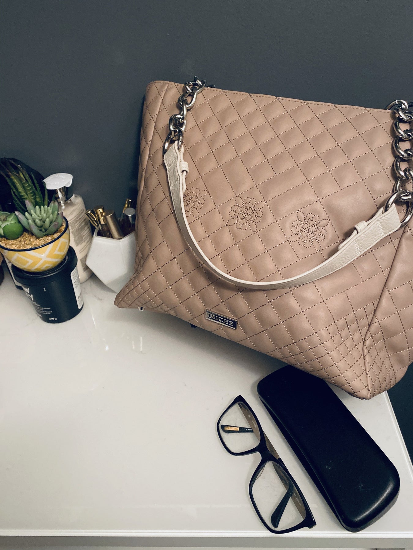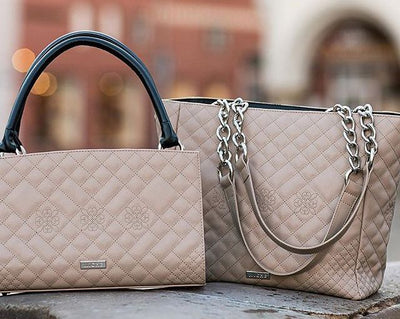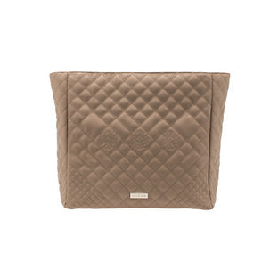 Grace, refinement, and beauty in movement, appearance and design. This beige tote look with it's quiet, quilted flower motif is restrained elegance personified.