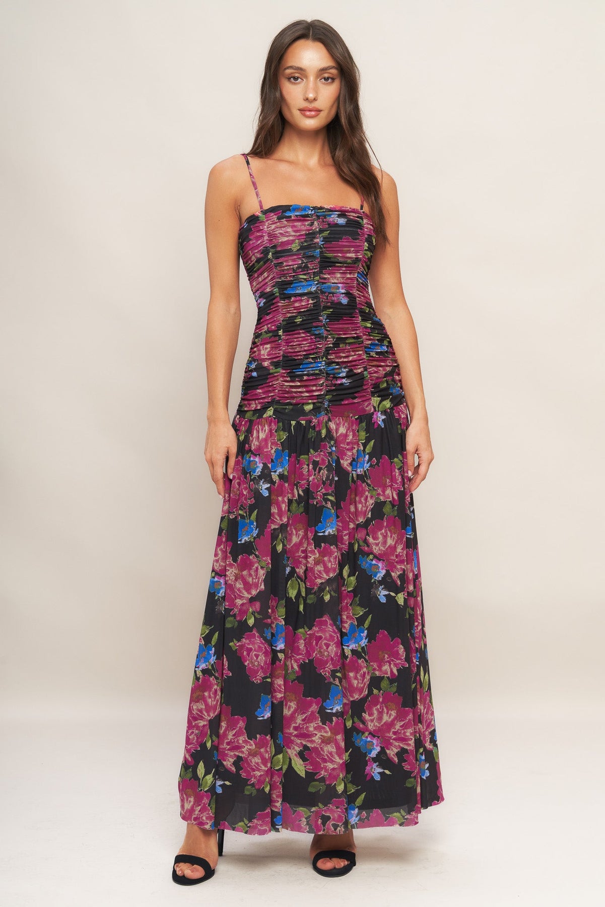 A printed power mesh maxi dress featuring straight neckline, straps, side shirring and back zipper closure