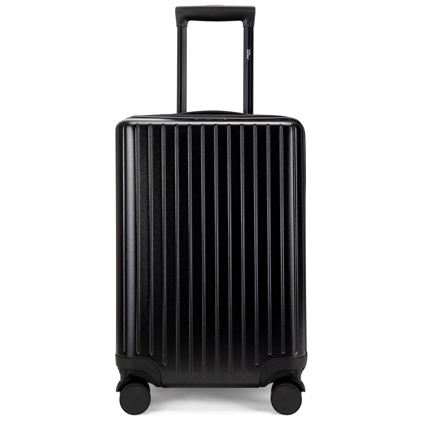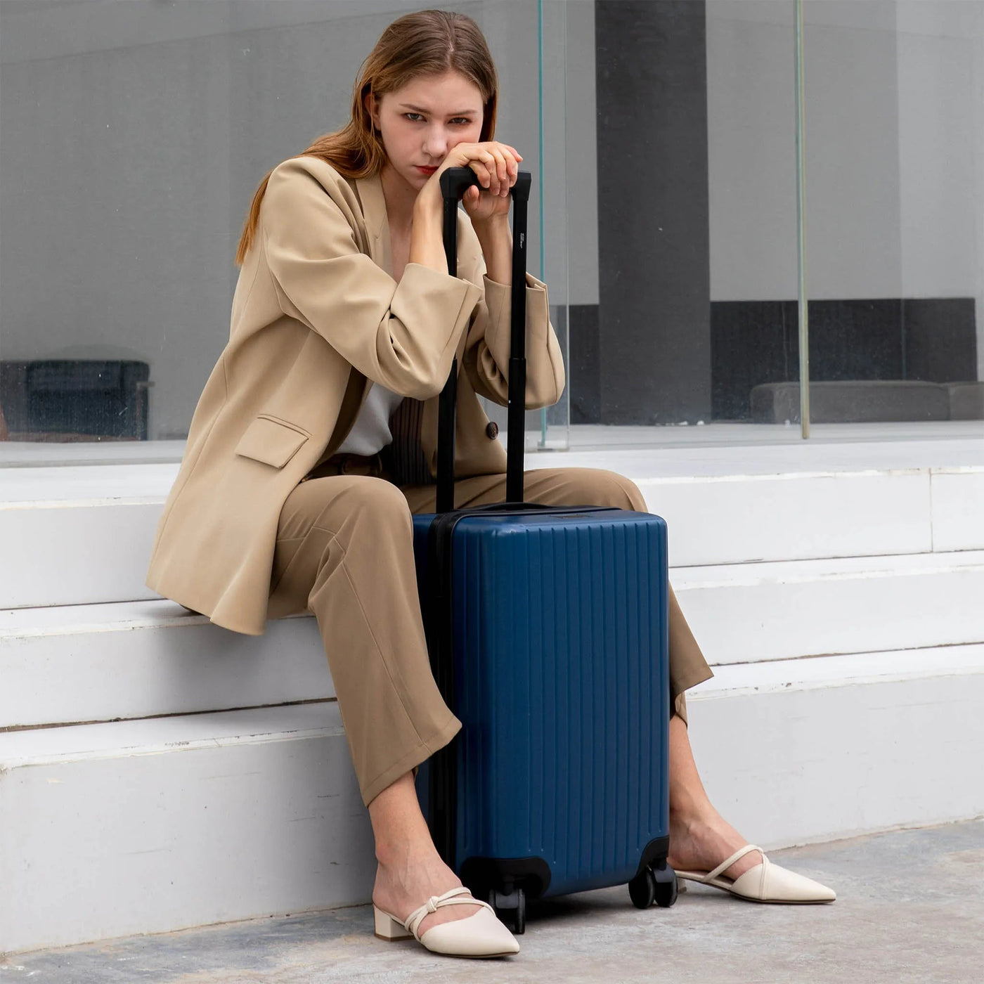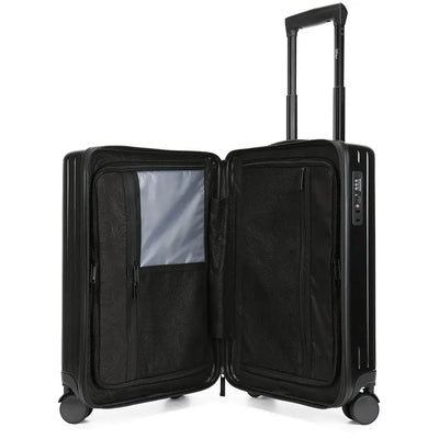 The suitcase interior is lined with a soft, water-resistant peach skin fabric, offering two fully separated zippered compartments and multiple pockets for effortless organization, including a leak-proof pocket for added convenience. Navigate with ease using our four recessed 360° precision roller-bearing double wheels and lightweight aluminum trolley bar, which delivers superior mobility with a 10-inch trolley drop per level.