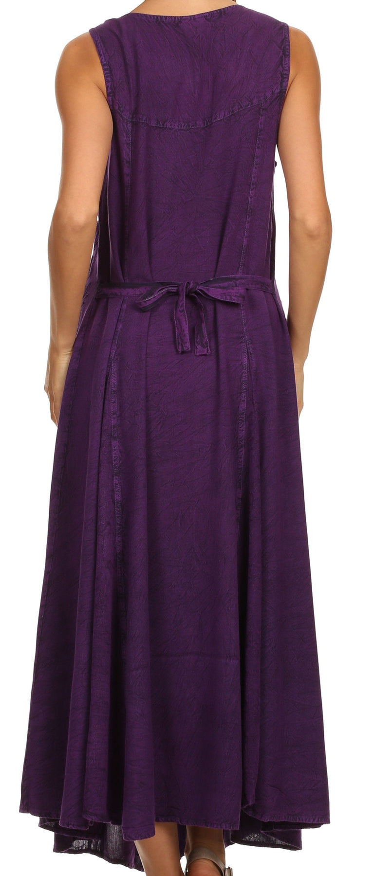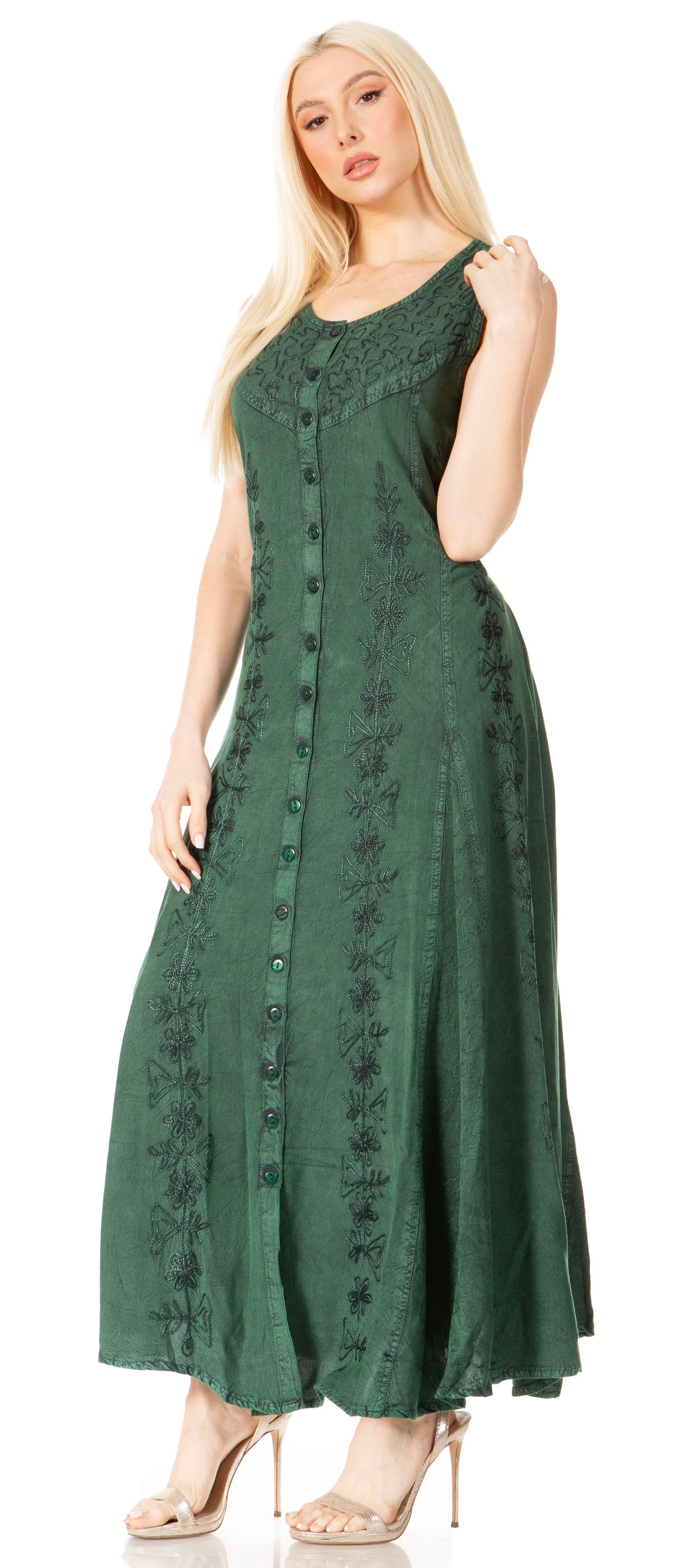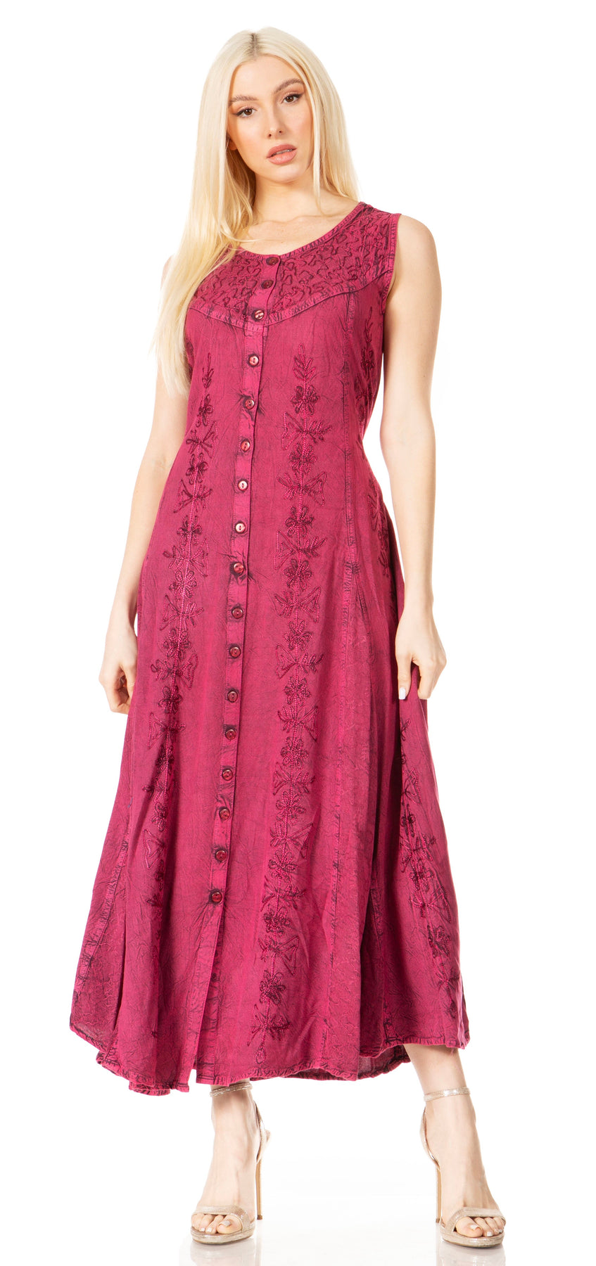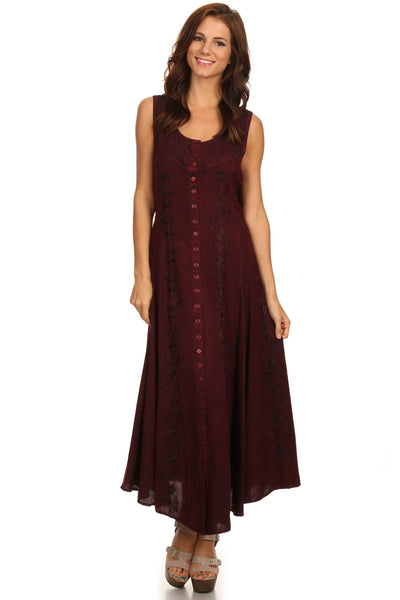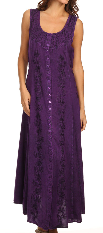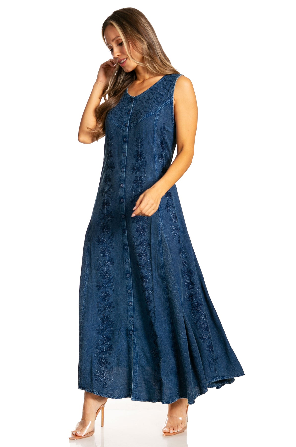 Sakkas Maya Floral Embroidered Sleeveless Button Up Rayon Dress