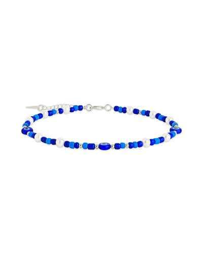 Introducing the Sibyl Anklet, the perfect accessory for your summer looks. Featuring lustrous pearls and delicate blue glass beads, this anklet exudes elegance. The evil eye charm adds a touch of protection and mystique. Enhance your style with the Sibyl Anklet.