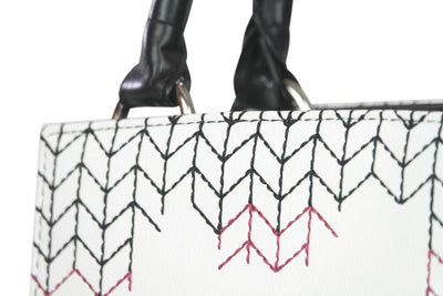 Brighten up your waredrobe with Skye's cheerful colors and captivating stitching. White faux leather with fuchsia accents and black piping are perfectly accented by the black and fuchsia stitching. This is a wrap around design. Grab some pockettes if you need more pockets!