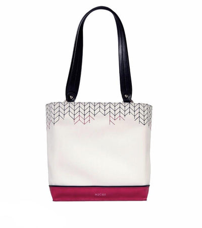Brighten up your wardrobe with Skye's cheerful colors and captivating stitching. White faux leather with fuchsia accents and black piping are perfectly accented by the black and fuchsia stitching.