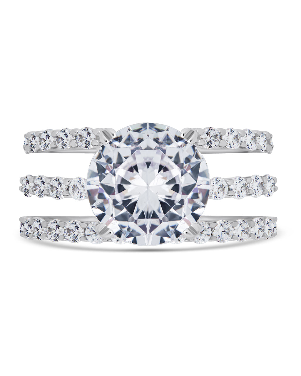 If your lady loves bold, sparkling pieces, she'll fall in love with this brilliant engagement ring set! It features three pieces -- two CZ-studded bands and a center ring with a bold and bright CZ stone.