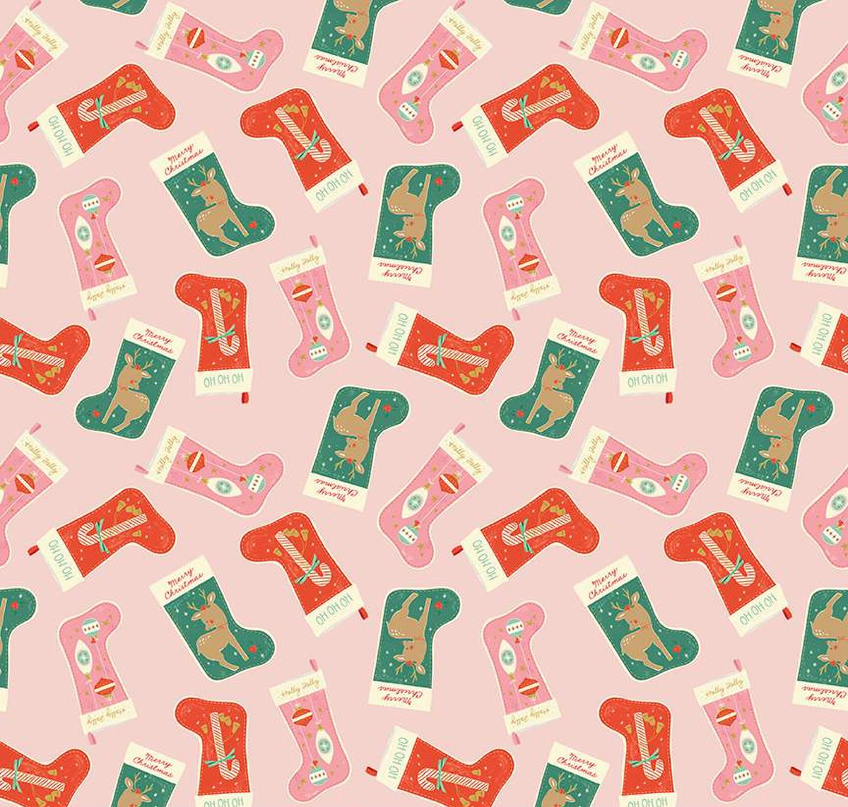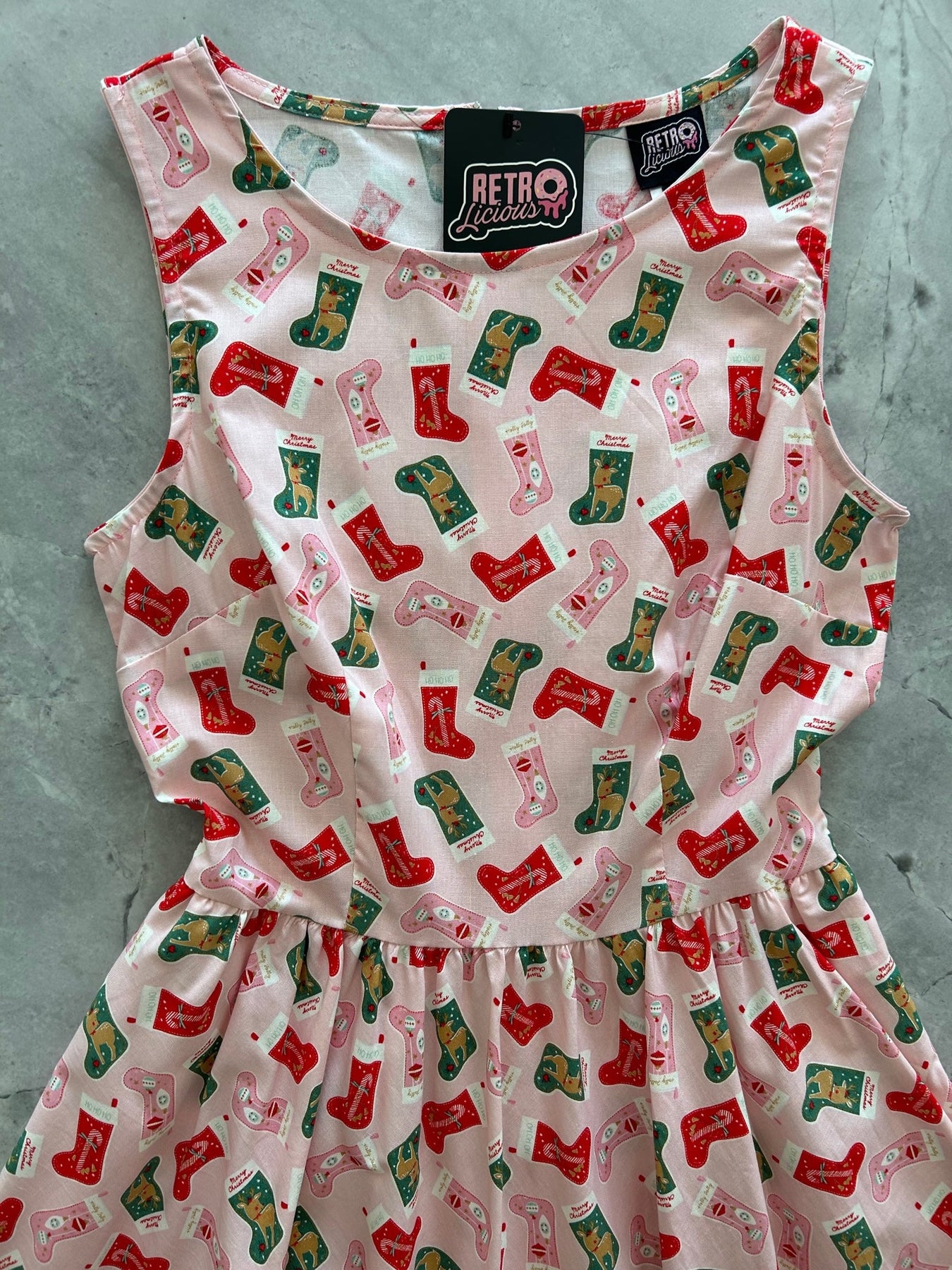 Introducing our Stockings Vintage Dress. This delightful dress showcases a tossed pattern of red, green, and pink stockings on a pretty pink background. It's the perfect choice for adding a touch of festive charm to your wardrobe. Step into the holiday season with this whimsical and colorful piece!