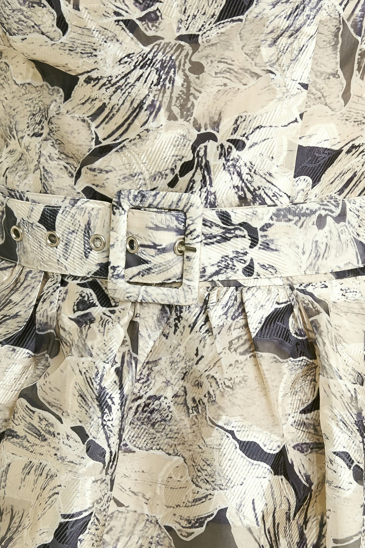 A textured woven midi dress featuring strapless, self belt, full skirt and back zipper closure