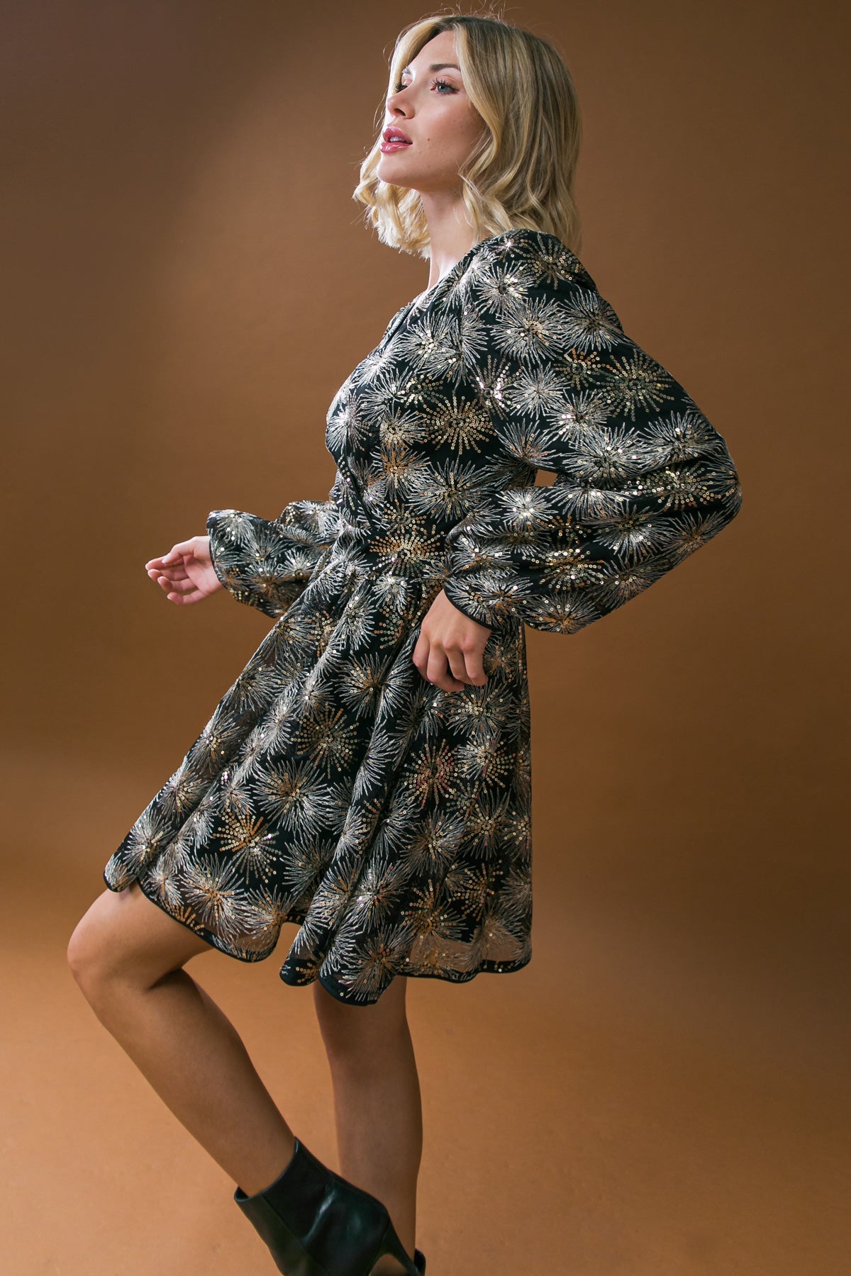 Brighten up your wardrobe with the STRAIGHT TO BUSINESS SEQUIN MINI DRESS. Crafted in a sparkling sequin fabric, this mini dress is designed with a surplice neckline, long puff sleeves, and a full skirt for a modern silhouette. It is finished with a back zipper closure for a secure fit. Perfect for occasions where you want to look extra dazzling.