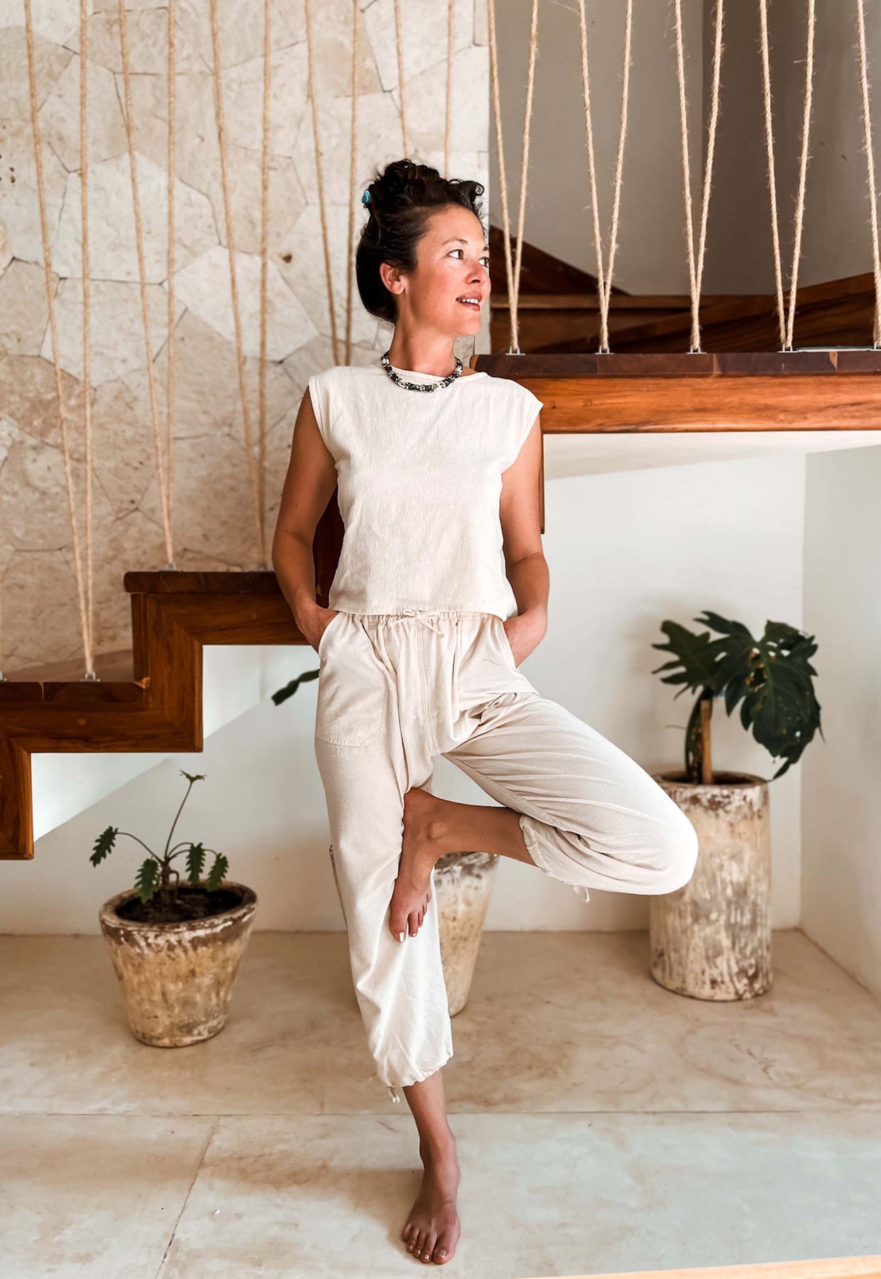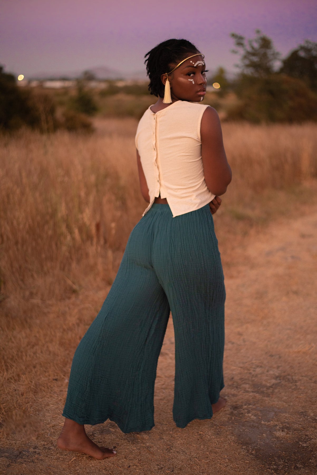 Experience freedom and comfort with our Tara Top, designed for effortless movement and breathability. Made from medium-weight, non-transparent cotton, this crop top features coconut shell buttons that accentuate the spine with a peek-a-boo opening on the bottom. We recommend pairing with our Sophia Skirt for a classic look, high-waist jeans for a casual ensemble, or with our Kali Joggers for a stylish jumpsuit-inspired outfit.