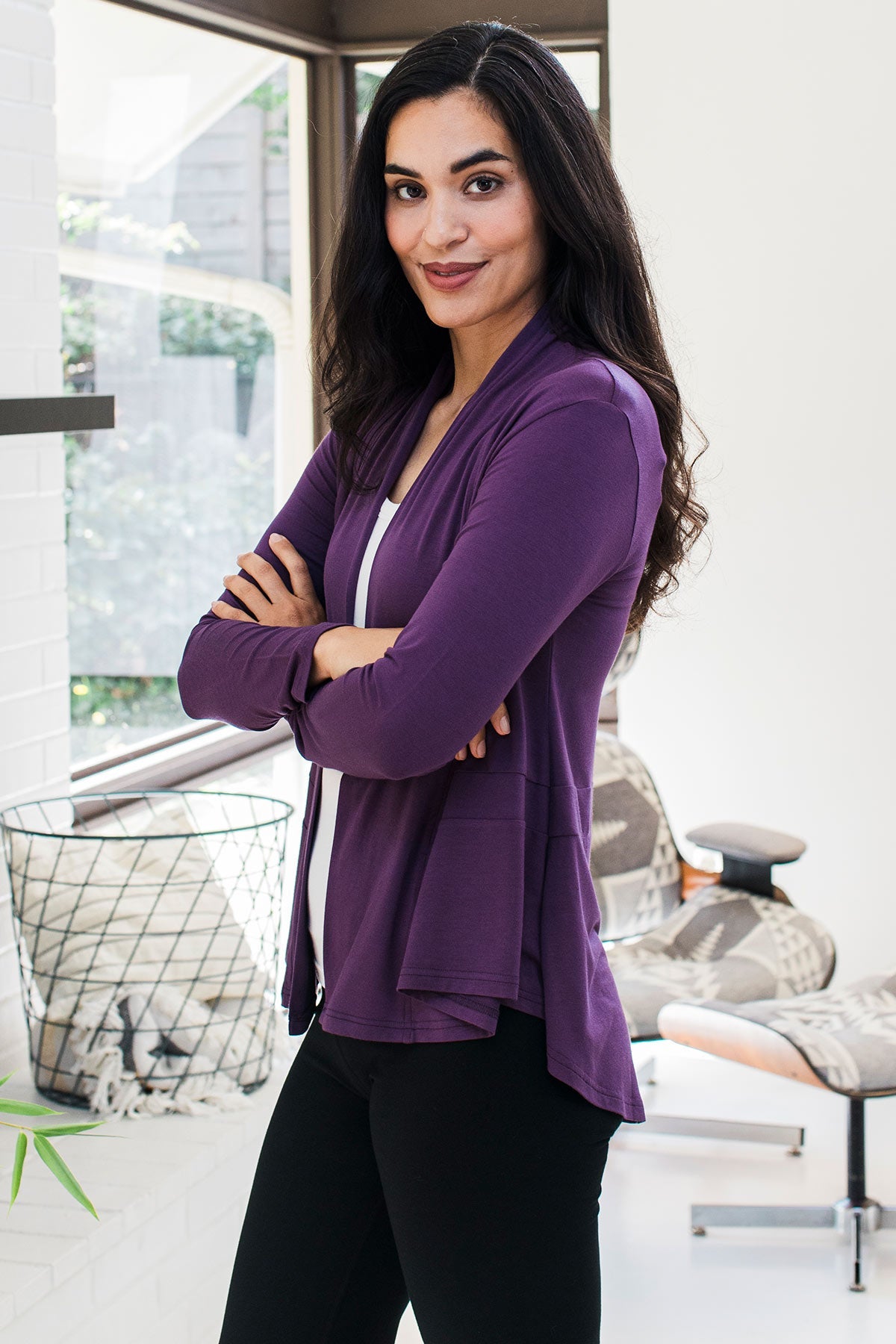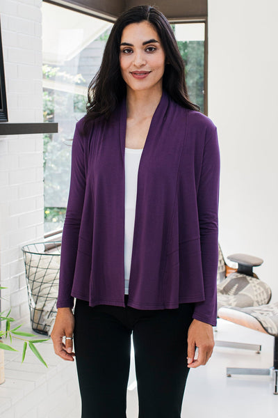 This lightweight, open collar bamboo cardigan embodies elegant simplicity. Toss it in your tote 'just in case' to prevent chills during weekend wine tasting or weekday errands. Slightly flared below waistband with a high-low hemline.