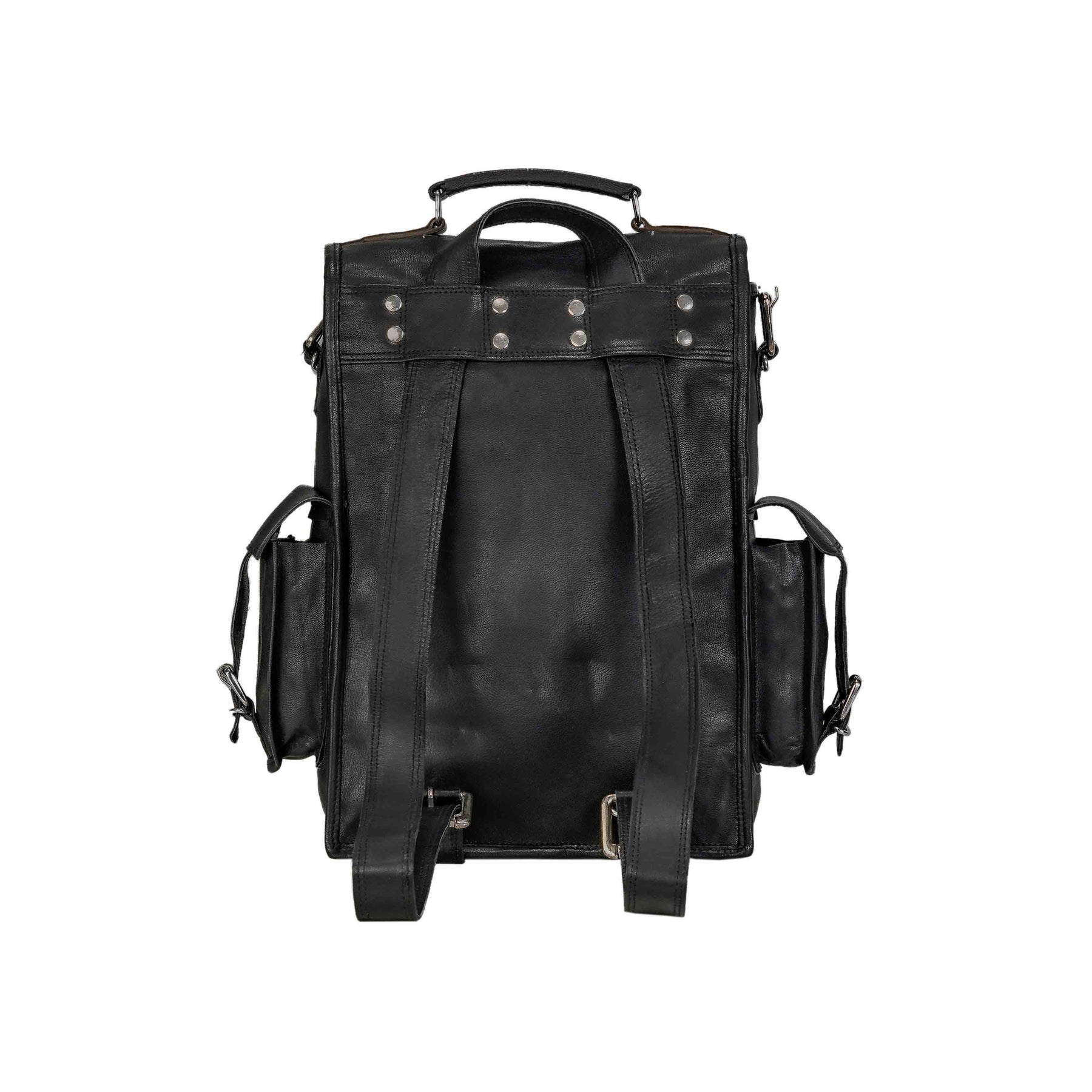 The black backpack bag is handcrafted from the finest quality full-grain goat leather to ensure precision and detailing. The nickel hardware used in the bag contrasts perfectly with the classic black color.