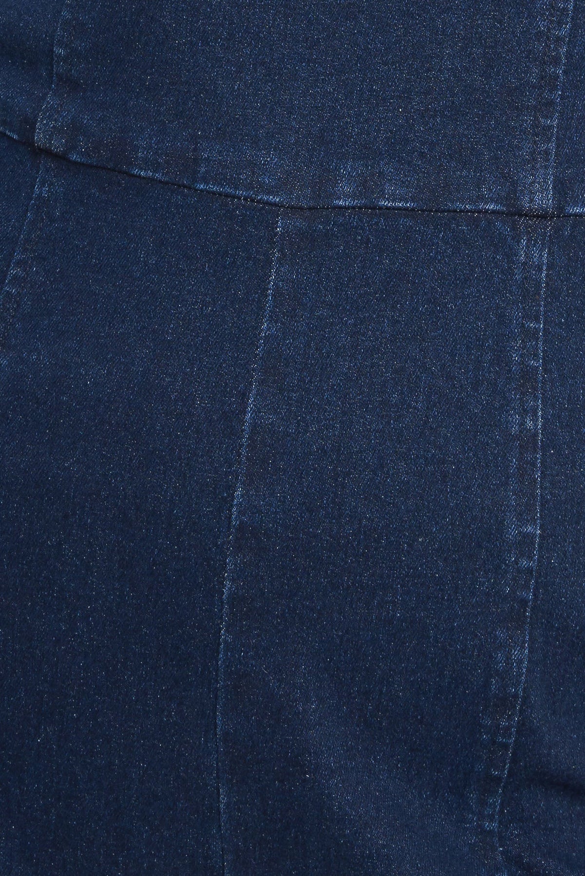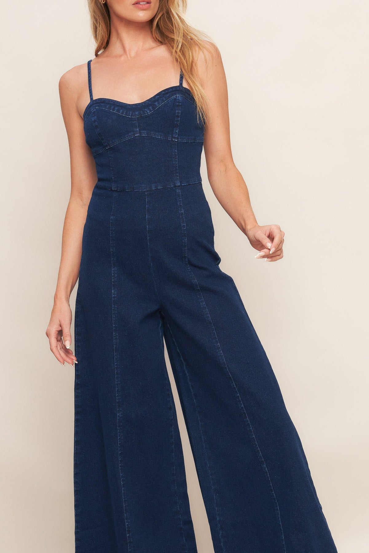 A washed denim jumpsuit featuring bustier top with straps, side leg and back zipper closure
