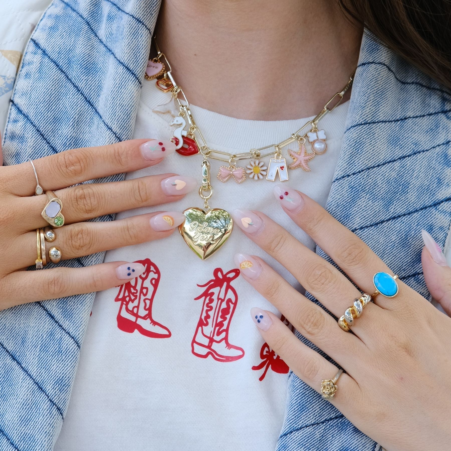 This ring features an oval turquoise glass stone as a statement detail with a 14k plated band. This statement and edgy ring is the perfect compliment to any outfit.