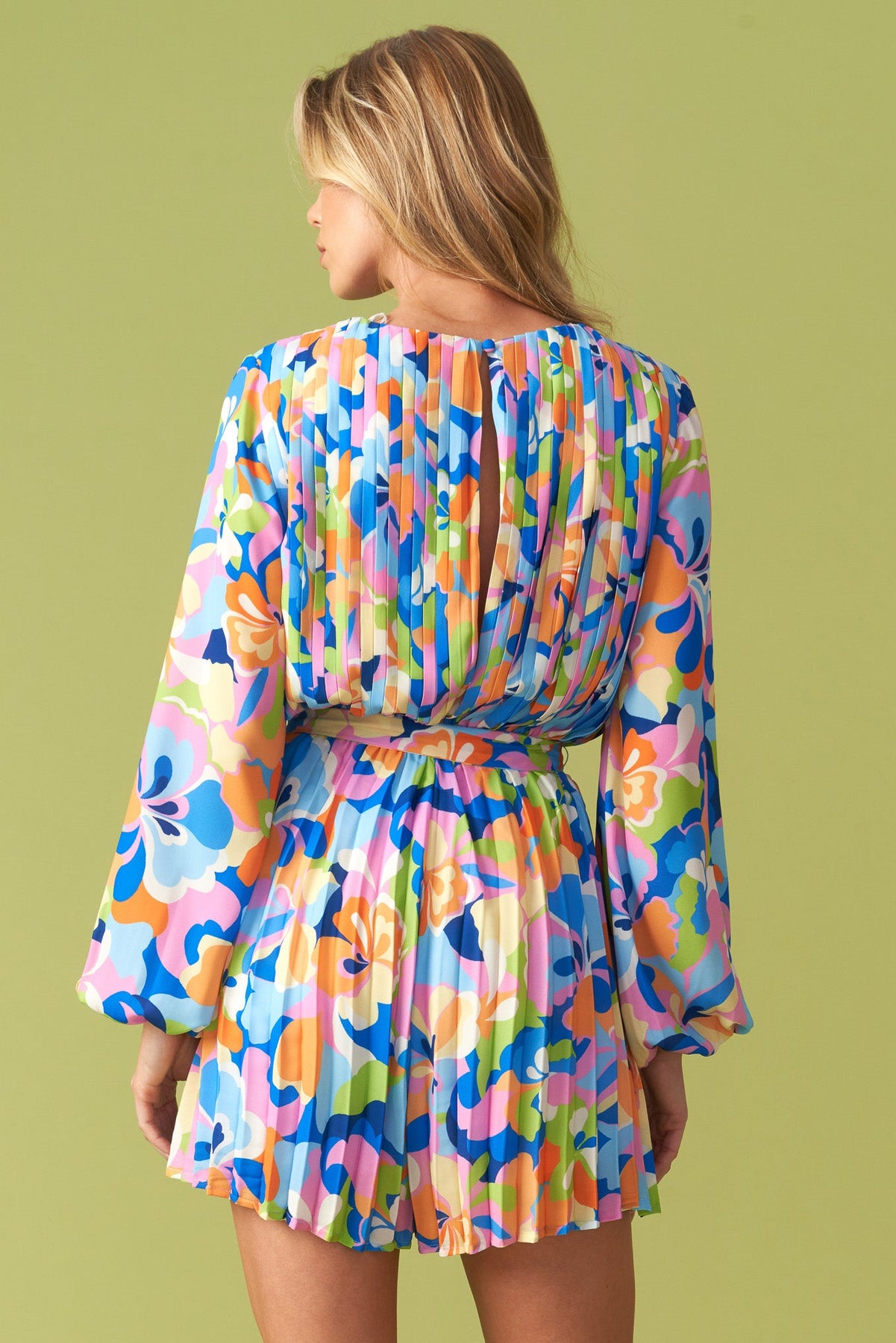 This woven romper boasts a printed design, round neckline, long non-pleated sleeves, pleated detailing on the top and bottom, and a back slit with a button closure.