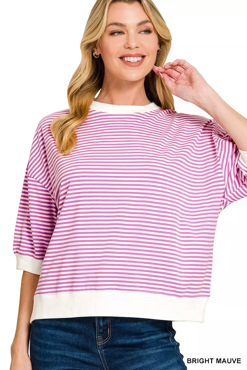The Striped Contrast Trim Banded Bottom Top is a fashionable and versatile piece that will enhance your everyday look. With its striped design and contrasting trim details, this top offers a modern and chic aesthetic. The banded bottom adds a touch of structure and style to the overall silhouette. Pair it with jeans or trousers for a polished and sophisticated outfit suitable for various occasions. Elevate your wardrobe with this stylish top that effortlessly combines comfort and trendiness.