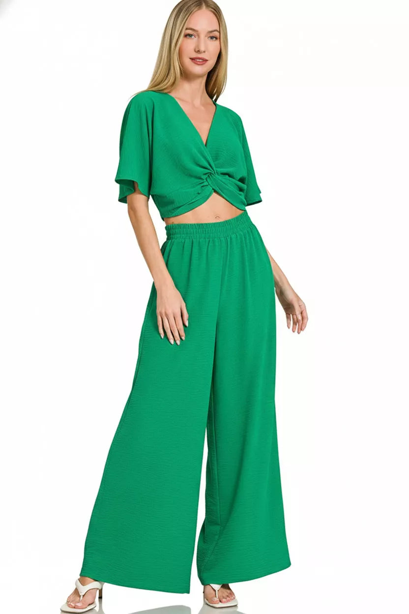 Zenana Woven Airflow Twisted Top & Wide Leg Pants Set